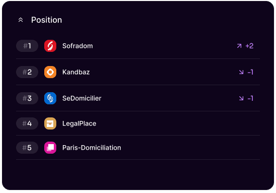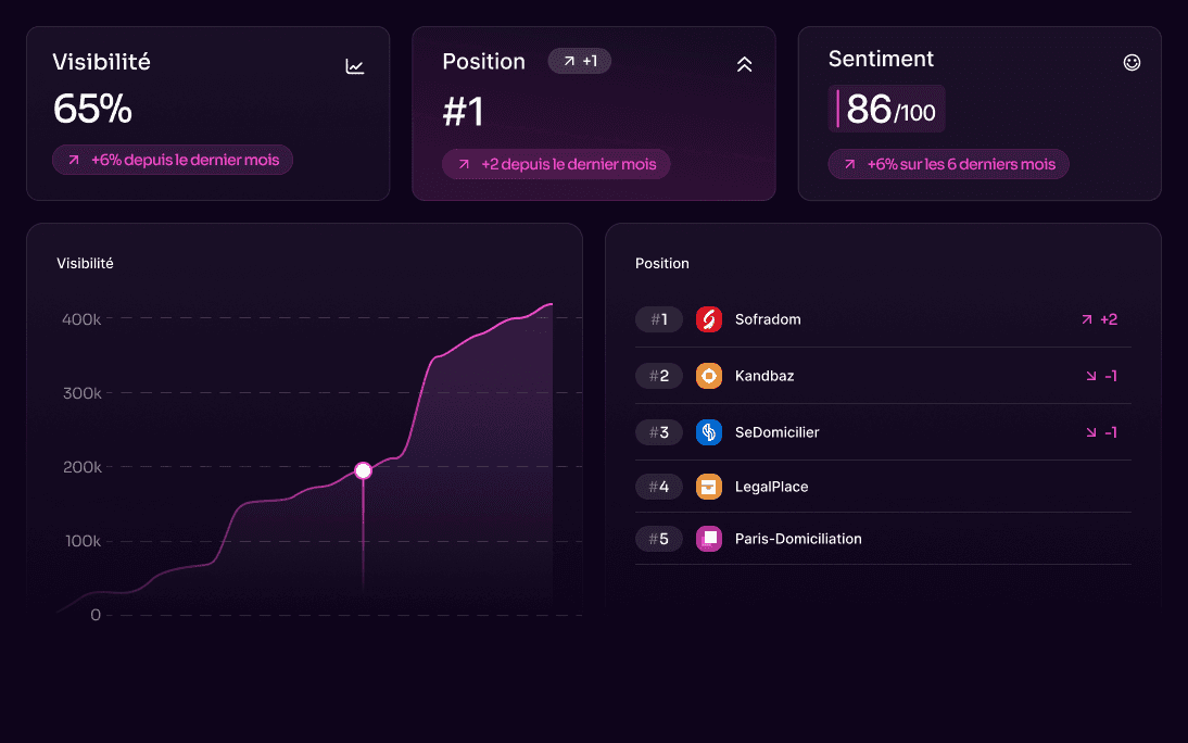 Notre moteur d’analyse GEO suit en temps réel quelles marques sont citées par les IA pour chaque requête pertinente. En optimisant votre présence, vous grimpez dans le classement, gagnez en visibilité et devenez une référence dans votre secteur.